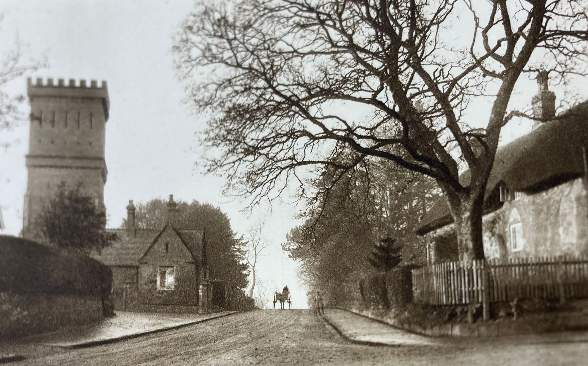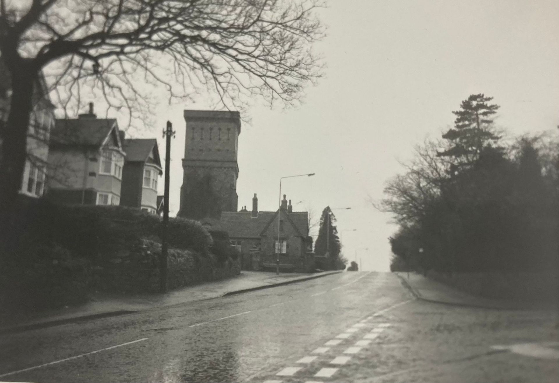 The main Black and White photo (with horse and cart) dated between 1900 – 1910 is taken from corner of Hill Street looking up Kilwardby Street/Moira Road and shows the Water Tower and Cemetery Lodge (now Tower Lodge) The Lodge was built when the cemetery was laid out in 1857/58. The thatched cottage on right corner may once have been a chapel. Bob Parker and his wife were living there in 1950’s (The cottage was demolished in 1960’s).