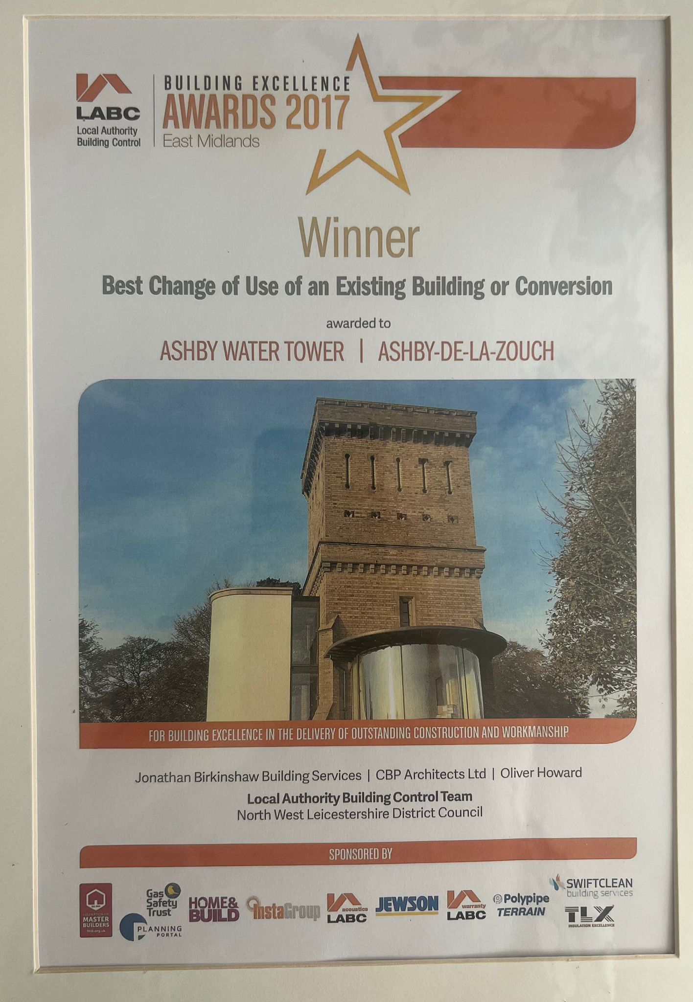 The Water Tower ‘Grand design-style’ conversion into a stunning contemporary home was completed in 2016 and won the East Midlands Local Authority Building Control (LABC) Excellence Award (2017) for the best change of use or conversion of an existing building. The works were carried out by Jonathan Birkinshaw Building Services, CBP Architects Ltd and Oliver Howard.