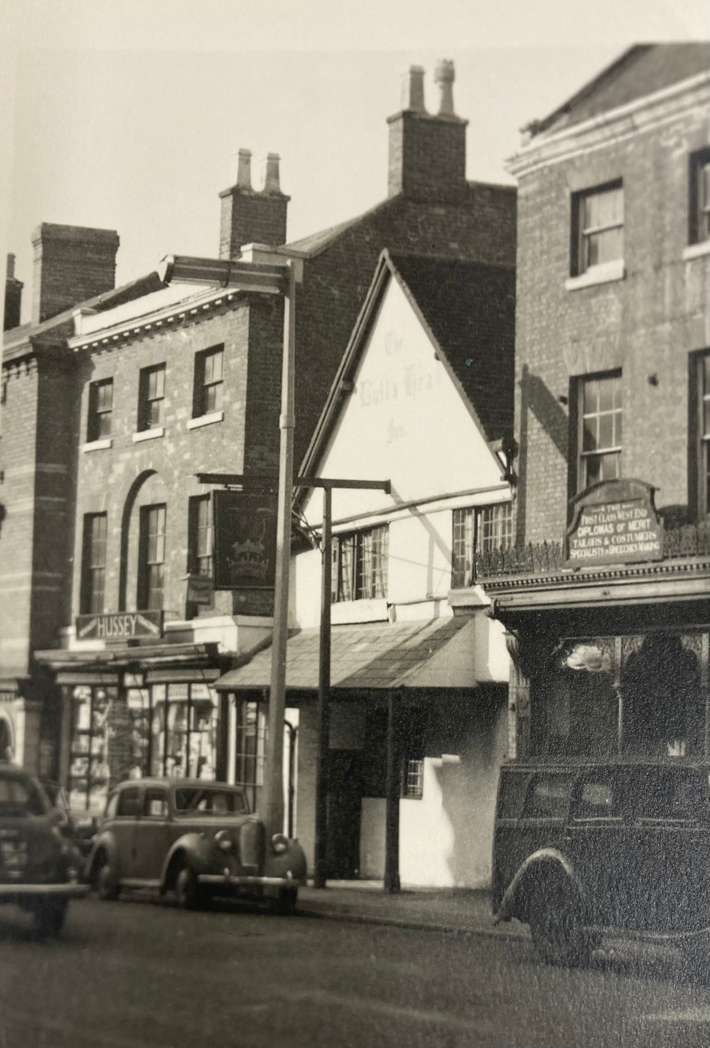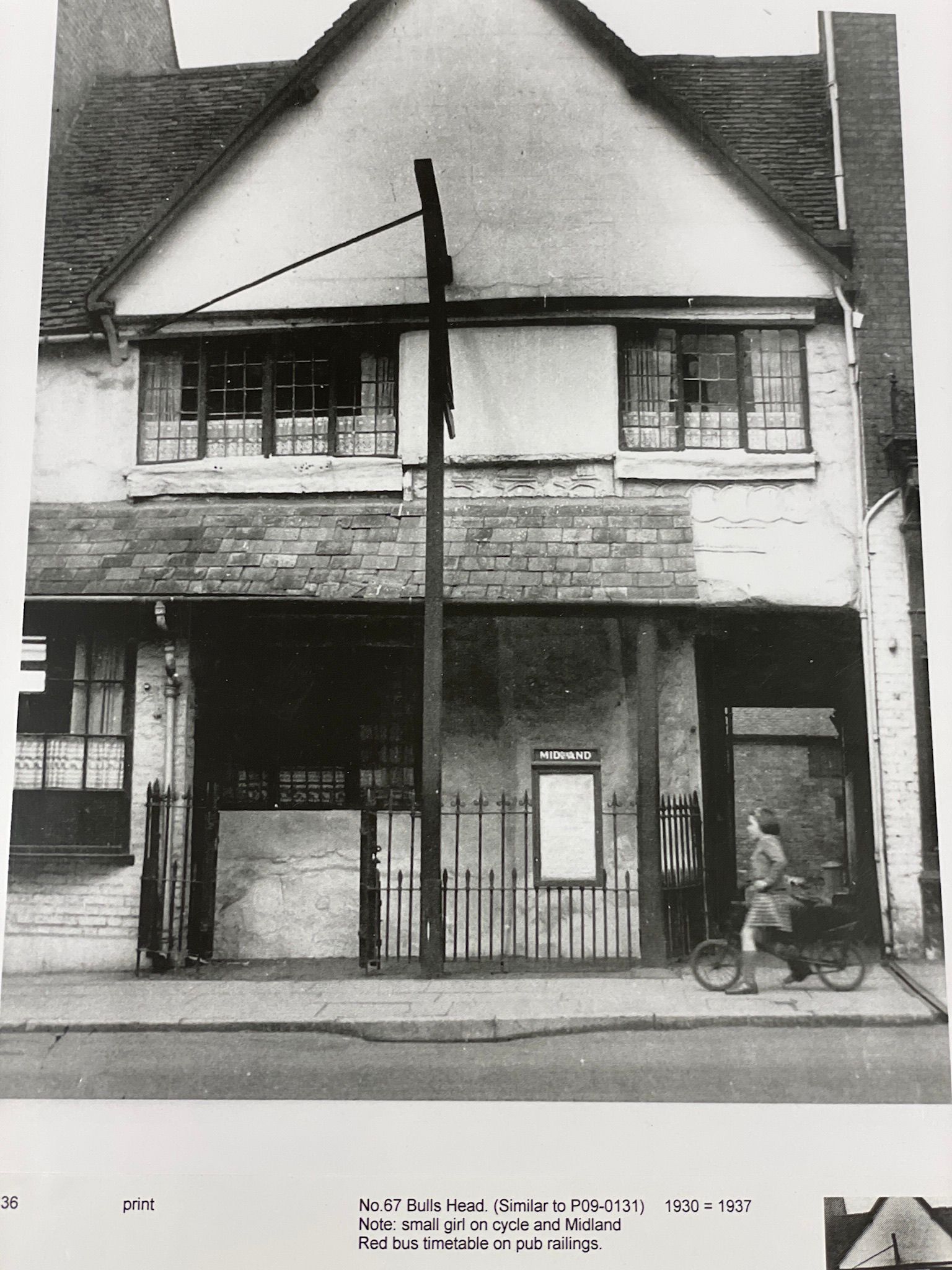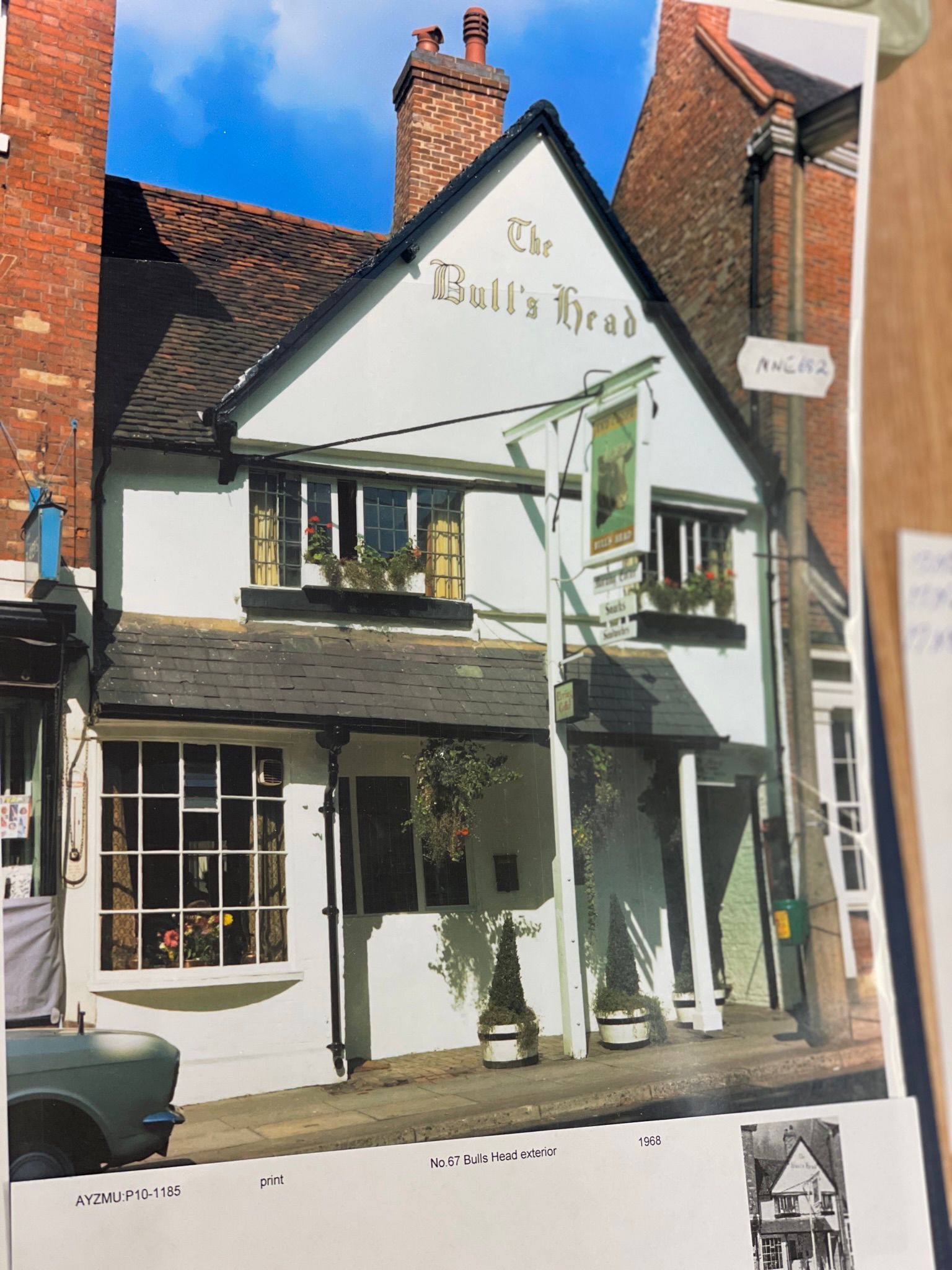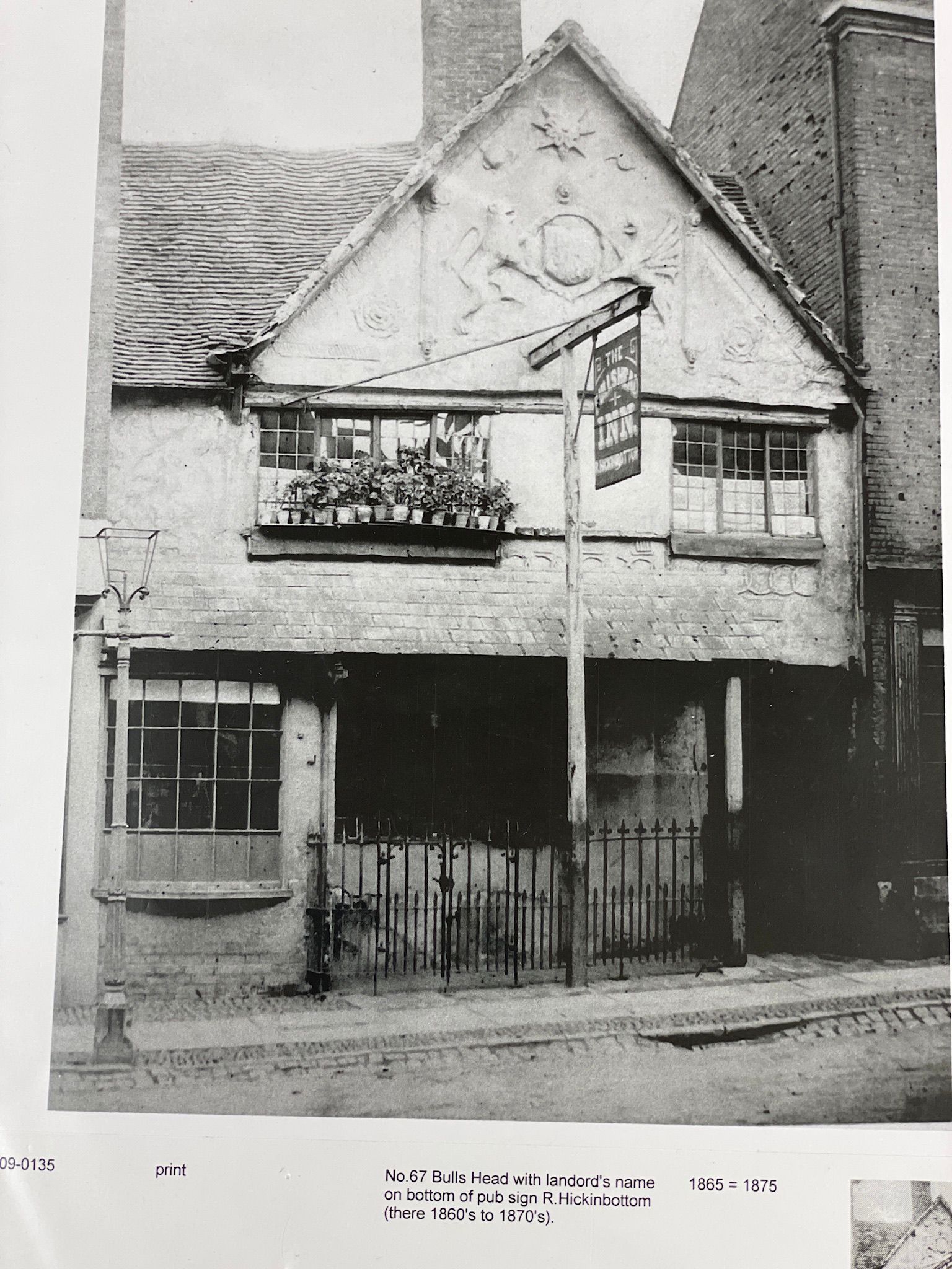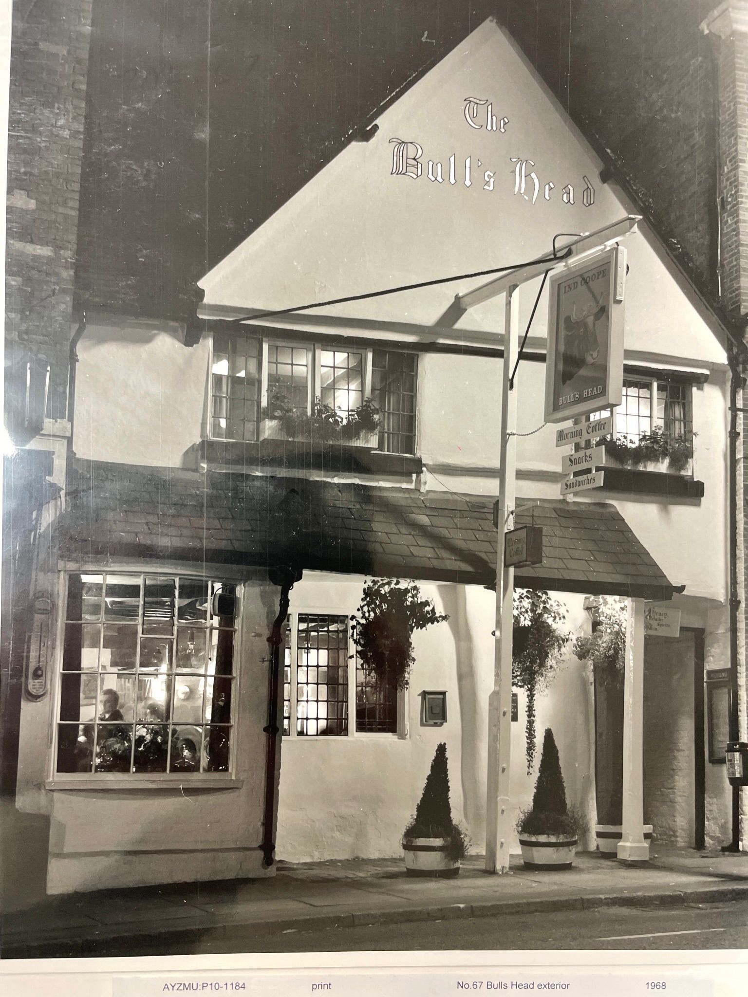 Until the 1960’s the Bull’s Head remained an antiquarian’s delight. It compromised a series of small rooms sharing an access to the bar, a snug, exposed timbers and beams, ingle nooks and panelled passageways giving a sense of intimacy and history. There used to be the signature of TV character Mr Pastry (Richard Hearne) on the pub wall. (He was a well-known comic personality of the 60’s.)